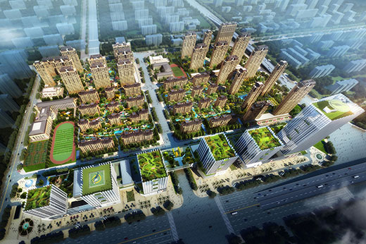 榮盛華府地處體育大街與和平路交匯處西北角,總建筑面積約135萬㎡,商業(yè)約48萬㎡,住宅約53萬㎡。