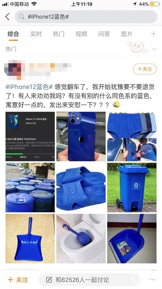 有網友在網上曝光了藍色 iPhone 12 的圖片,吐槽和官網色差嚴重,還有人找到了一組和 iPhone 同款的藍色物品,瞬間在網上發酵炸開了鍋,這個話題也迅速沖到了熱搜榜第一。