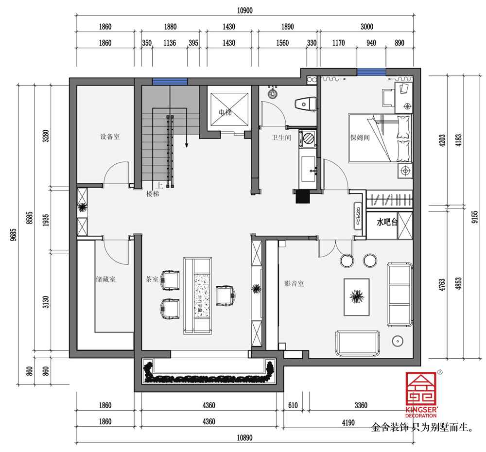 ② 利用采光不足增加影音室。合理利用采光與通風(fēng)將天井附近區(qū)域劃分為茶室。