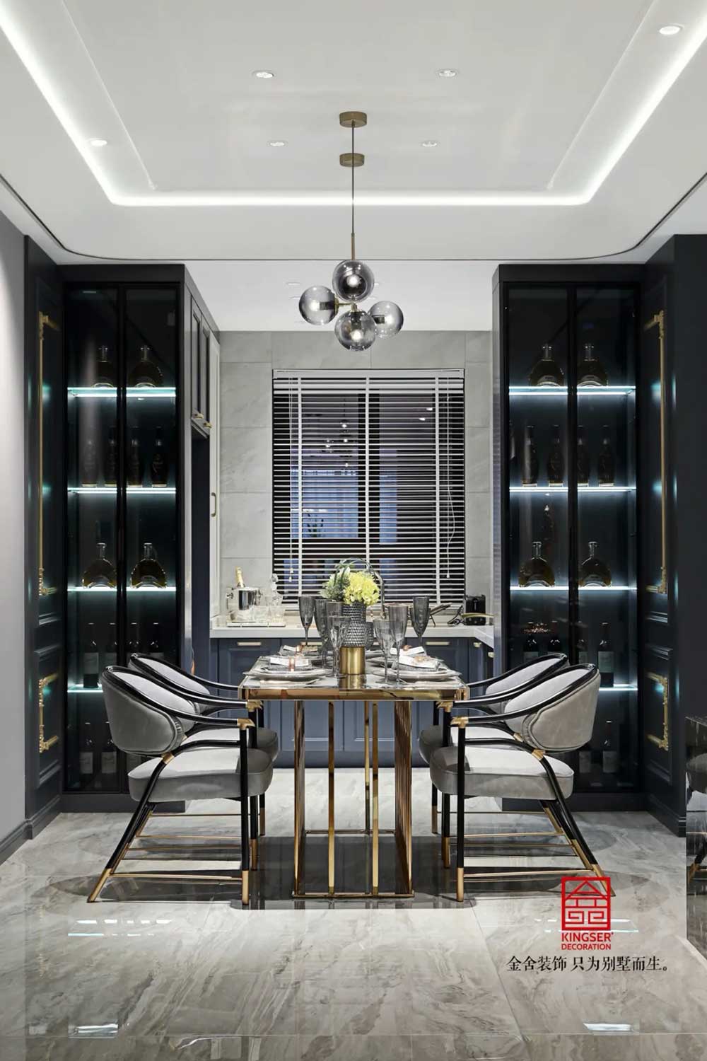 深藍、古銅和灰色調勾勒出紳士的高雅格調和品味。從空間利用到配色處理,匠心獨具,每一個空間都濃縮著設計師對新古典的獨特理解。
