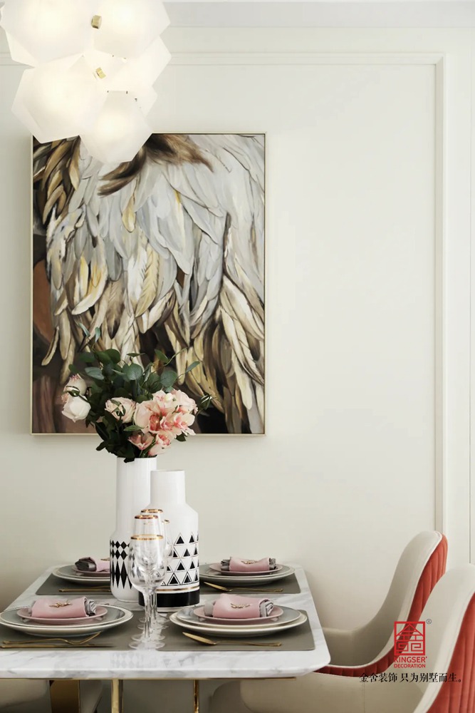 餐桌上配有輕奢風格的花瓶和餐具,提升房間的華麗氣質,讓空間不再單調。白色與橘紅配色的餐邊椅也讓整個空間看起來更具時尚的溫度。