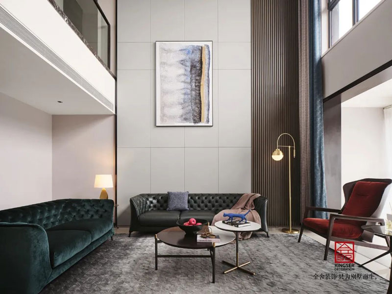 本案的軟裝出自于鸚鵡螺國際軟裝的全程設計,一個巨大的挑空區域中,每一個細節的把握都關乎著整個家居的展現效果。設計師對于整個空間的設計來說都是遵循著由下自上,由內及外的設計表現順序。從一個色彩推及到整個空間,從一個造型推及到整個大的區域,本案中的莫蘭迪綠和與它的相近的色塊多次出現在空間之內,讓空間更加的和諧、統一、共生。