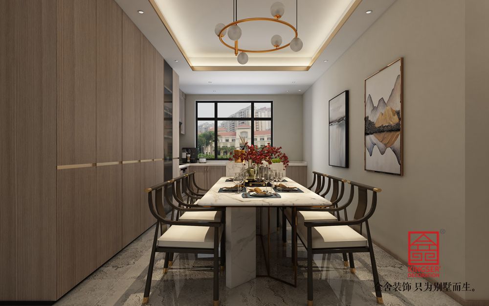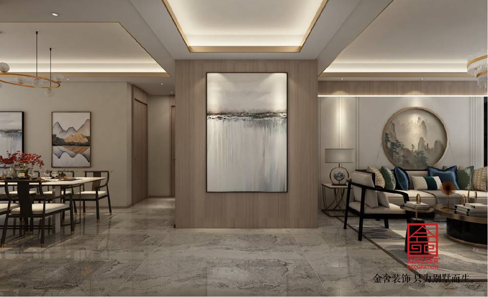 設計說明:此案例為石家莊金舍裝飾-融創中心180平米新中式風格裝修案例。新中式風格不是純粹的元素堆砌,而是通過對傳統文化的認識,將現代元素和傳統元素結合在一起,