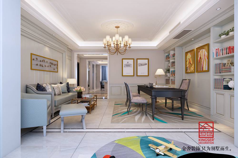 設計說明:此案例為石家莊金舍裝飾-榮盛華府200平米混搭風格裝修效果圖。傳統的客廳以電視墻為主導,沙發和茶幾的高度往往相差不大,這樣的高度差對于孩子寫作業或是成年人看書寫字和使用電腦是沒有舒適度可言的,因此一些有工作和學習需求的家庭可以考慮把家庭工作室融入客廳,利用靠墻的大操作臺和各種墻面擱板架,滿足多人工作的需求