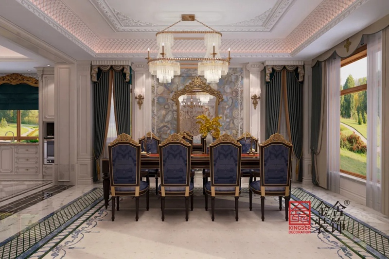 餐廳在細節的邊緣和花卉中點綴了金光閃閃的金色,讓整個空間熠熠生輝。同時在餐廳的餐桌還是餐邊鏡還是家居構設,每一處的設計,都經過設計的精細打磨,因此,能夠在實景中裝飾出完整純正的法式風范。