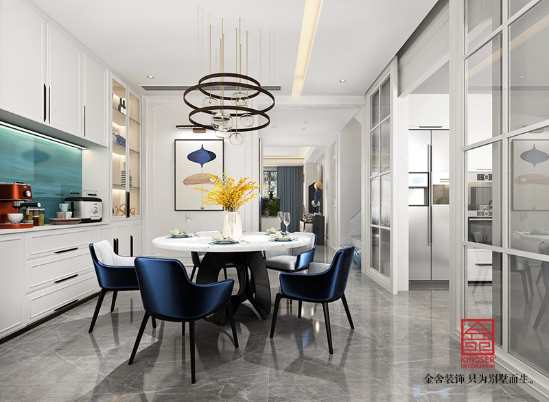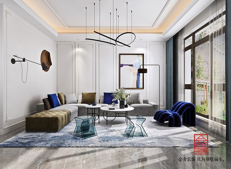 此案例為石家莊金舍裝飾-大者別墅200平米現(xiàn)代法式裝修效果圖。半個(gè)世紀(jì)前,在意大利米蘭的畫展上,克萊因的藍(lán)色首次亮相,八幅同樣大小、布滿天鵝絨質(zhì)感的藍(lán)色畫布讓人驚喜。我們從藝術(shù)展中獲取靈感,運(yùn)用到室內(nèi)設(shè)計(jì)中,試圖營造一種極具藝術(shù)感的現(xiàn)代空間。