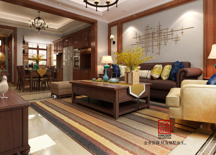 設計說明:此案例為石家莊金舍裝飾-西山林語190平米美式風格裝修效果圖 。一個幸福的5口之家,年輕小夫妻帶著可愛的寶寶和父母一起生活。他們最求生活品質,喜歡自由,優雅,自然閑適的居住環境。客廳空間憑棄過多的繁復裝飾,用簡潔的設計手筆和創新的搭配,著重與材質,色調與空間的對話。地面采用仿石材拋45度柔光磚營造溫馨自然的感覺,讓整個空間在不經意間流露出高壓的格調。敞開式的廚房將中西廚及餐廳融合在一起,使得整個空間的采光得到改善,同事也大大的增加了餐廳的空間視覺。