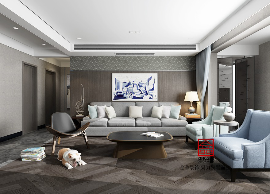 設計說明:此案例為石家莊金舍裝飾-保利拉菲公館197平現代輕奢裝修效果圖。入戶玄關,整體風格定調為現代意大利輕奢風格。硬裝顏色多與黑白灰為主,暖咖色為輔。由于原始結構房高僅有2720,所以頂面無任何多余裝飾線,主要用光影以及凝練的線條去劃分空間感,地面兩種材質去劃分空間,底色多以灰色系為主,軟裝家具用亮顏色去填充家中的冰感??蛷d硬裝顏色劃分為兩個部分,頂面與電視墻相接,淺色調裝飾,墻面雅士白天然大理石點綴輕奢,沙發墻與地面相接,暖咖色系,多以木制品出現,更為柔和。